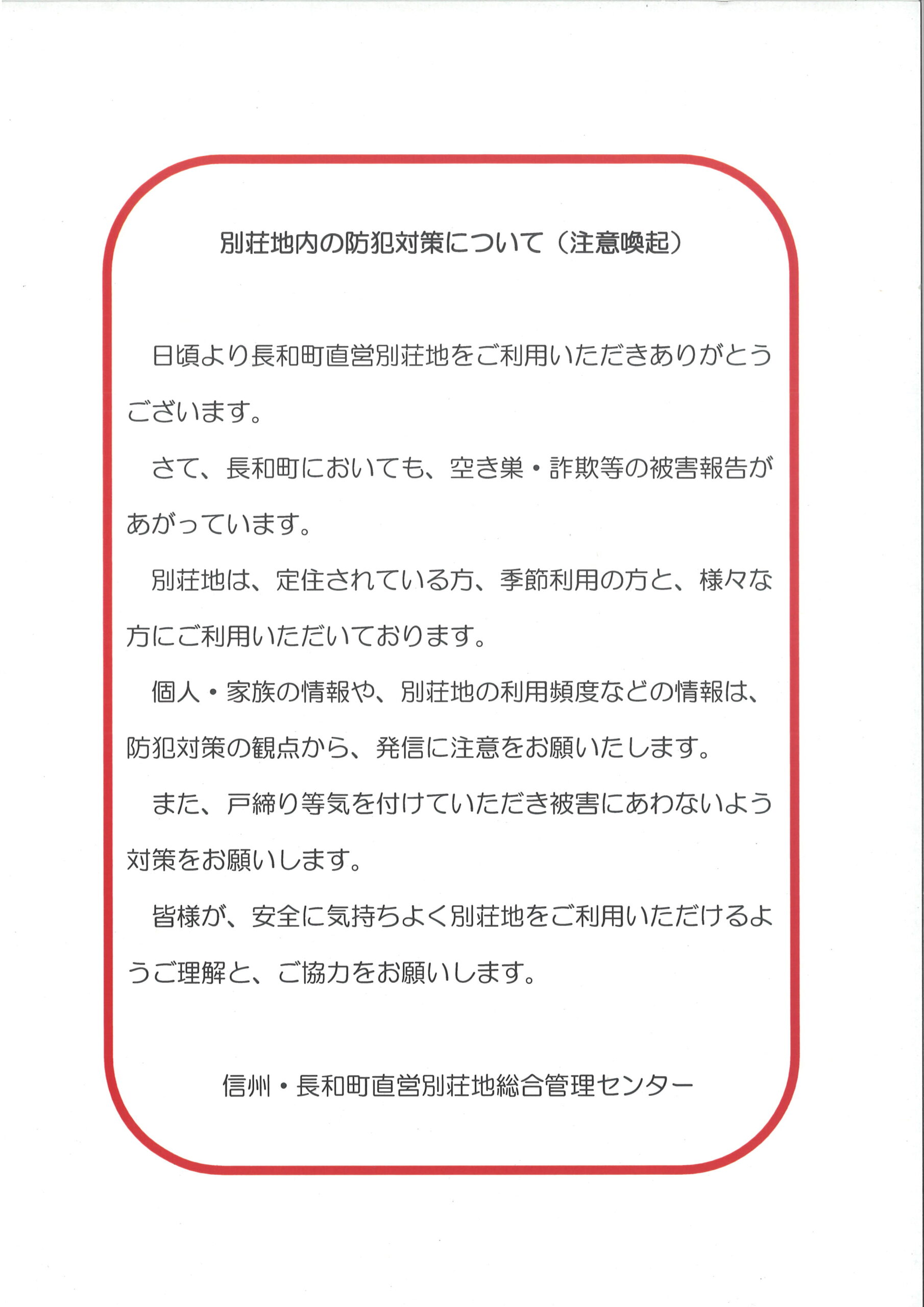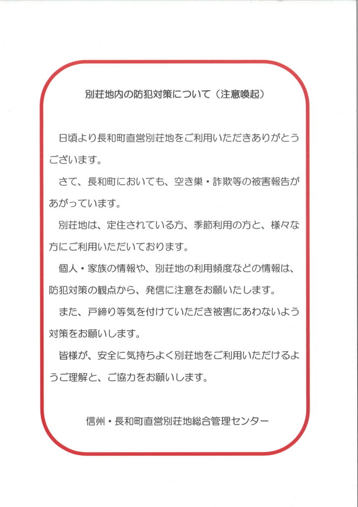 ハイシーズンは、ご家族ご友人など多くのお客様が別荘地をご利用されるかと思われますが、待避所、転回場への車両の駐車をしないようご理解ご協力をお願いします。